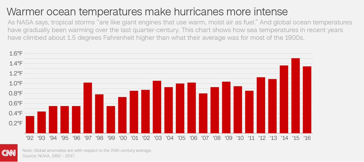 Climate change is becoming an increasingly sensitive debate, especially after Hurricane Harvey and Imra barrelled through the states of Texas and Florida. For scientists, drawing links between warming global temperatures and the ferocity of hurricanes is about as controversial as talking about geology after an earthquake. But in Washington, where science is increasingly political, the fact that oceans and atmosphere are warming and that the heat is propelling storms into superstorms has become as sensitive as talking about gun control in the wake of a mass shooting. Dr. Kirtman and Dr. Berry are among a group of Florida scientists who confronted Governor Rick Scott in recent years for his refusal to acknowledge that human-made greenhouse gases are driving climate change. Last year they wrote a letter to then-candidate Donald J. Trump asking for a meeting to discuss the consequences of climate change in Florida, to which the Trump campaign never responded. It seems almost indisputable that climate change is the reason why hurricanes are becoming more and more common. Traditionally, hurricanes begin as tropical storms over the warm moist waters near the equator. As the moisture evaporates it rises until enormous amounts of heated moist air are twisted high in the atmosphere. The winds begin to circle counterclockwise north of the equator or clockwise south of the equator. The reatively peaceful center of the hurricane is called the eye. Around this center winds move at speeds between 74 and 200 miles per hour. As long as the hurricane remains over waters of 79F or warmer, it continues to pull moisture from the surface and grow in size and force. When a hurricane crosses land or cooler waters, it loses its source of power, and its wind gradually slow until they are no longer of hurricane force--less than 74 miles per hour. Usually, the waters by east coast of the U.S. are cool enough that hurricanes generated near the equator die down before they get too close to coastal states. However, as climate change has increased the average temperature of our earth's oceans, hurricanes created by the earth's equator are fed by warm water right up to the east coast, and, by the time they have reached the east coast, they have travelled far enough that the storm will likely be category 4 or 5. Irma and Harvey are both examples of this trend.